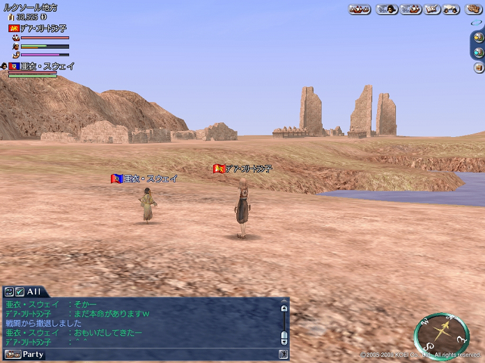 次に乗る予定のキャラックには冒険Lvが少し足りていなかったので^^; そんな時、亜衣さんの2ndさんの麻衣さんからTELLが入りました。 で、今回は麻衣さんとごいっしょに行動させていただきました^^ 奇しくも麻衣さんも商用キャラベル。 キャラベル艦隊編成です^^ いつもよりさらにマターリとした旅になったような気がします。 この日チュニスで出たクエが『正者の街』。 デアでは宗教学が足りないので、後日亜衣さんにご協力いただくようお願いして終了となりました。 日を改めて亜衣さんと『生者の街』のクエです。 無事カルナック・ルクソール神殿を発見。 こういう発見物があるから 冒険はおもしろいですね。 この後ハイダル一味に襲われて、デアは逃げ切れずに倒されて奥地入り口に強制移動^^; 最後はハイデルさんも一緒に 記念撮影w おかげさまでキャラックに乗るためのLvにも到達することができました^^v 船を乗り換えたら、今度は北方の街めぐりですかねー PR ![]()