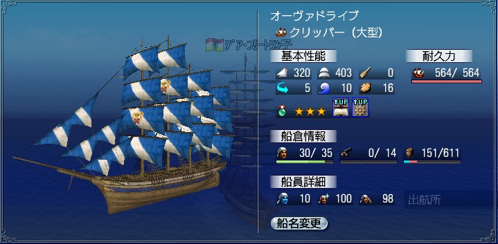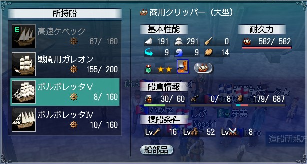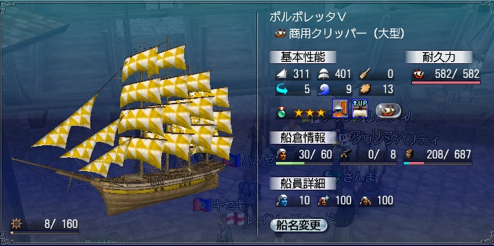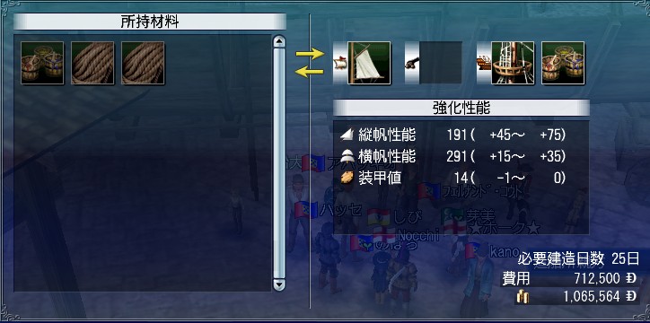 × [PR]上記の広告は3ヶ月以上新規記事投稿のないブログに表示されています。新しい記事を書く事で広告が消えます。 今年も押し迫ってまいりましたが皆さんはいかがお過ごしでしょうか? さて、N鯖はといいますと、今はデアがお休みで 主にハッセを動かしております。 うpデート前からカリブで海事してたのですが、海事Lvが45にあがったところで、 乙鯖の経験をフィードバックして南蛮貿易に乗り出す事にしましたw 海事で資金も寂しくなってきておりましたので^^; ただ、うpデート前の主力交易船は急加速なしの商用クリッパーなので、 このままではジパングの交易は辛くなる事は必至です>< しかし、うpデート後のFS造船では、クリッパー系のお船には もれなく急加速を付けれるという情報が^^ FS部品はバザ売りもしていますが、昨今のFSブームで価格は高騰してます>< そこで急遽ハッセをアルティザンに転職させてFS部品を造らせまくりましたw もともとハッセには、JB部品作らせるために工芸と縫製(とおまけに鋳造)を 取らせましたが、物になる頃には必要な船は揃ってしまって腕を振るう機会が ほとんど無く(´・ω・`)な感じでしたが、やっと陽の目を見ることができたと言える かもです^^ で、部品はできましたが、施工してくれる知り合いの船大工さんが年末の為か 誰もINしていません>< 商クリ強化に必要な造船Rは11で、一応ハッセもブースト込みで造船R9なので、 +5範囲内の強化が可能の為、自分でなんとかできそうです。 ただ、自分のR以上の強化をすると性能が下がるという情報も出ています。 具体的にどうなるかがよくわからなかったので不安ではありましたが、 後日またリセットして強化し直せばいいと思うことにして、試しにやってみました。 実施前がこれで 部品を組み合わせて 25日待ちますと ちゃんと急加速が 付いてました^^ 帆の性能も額面よりは低め ですが上昇しています。 帆を付けた状態がコレ ちなみにコレはNデアの クリッパーです。 強化後の商クリは 少し帆性能が低いだけ になってます。 やっつけ強化でもここまでの性能なら満足いくものと言えるかと思います^^ 反面、苦労して乗れたクリパに匹敵する船が交易上げで簡単に乗れそうな事を 考えると複雑な気もしますが^^; ただクリパも造船Rの高い状態で強化すれば、旧JB以上の性能は出るかと 思われますので、あまりがっかりしなくてもよいかもですね。 そんなこんなで副官に船を与えてジパングに向かいましたよ。 うっこりして5M持ったまま航海してたりもしましたが気にしないw 乙デアと同じ航路を取りまし たが、こちらは80日で到着。 急加速のありとなしでは やはり違うようです^^ こうして無事長崎にたどり着きましたが、現地で買った沈香が売れずに 足止めを食いましたとさ( つД`) PR |
